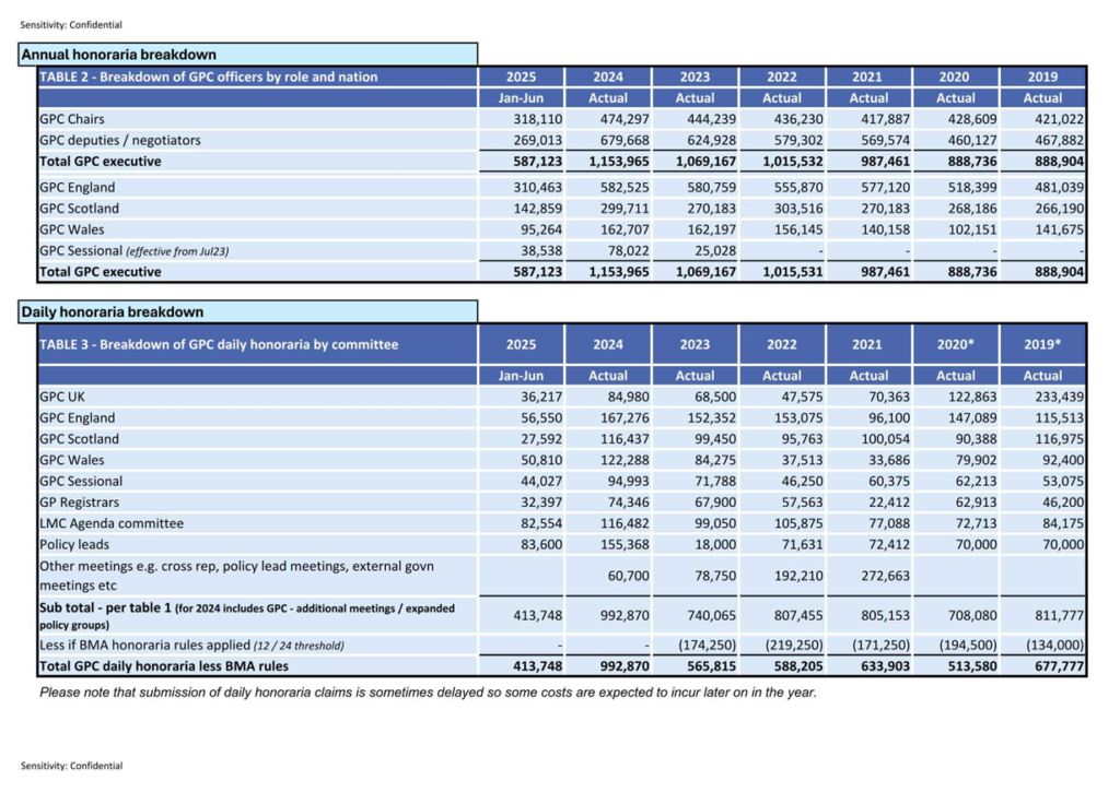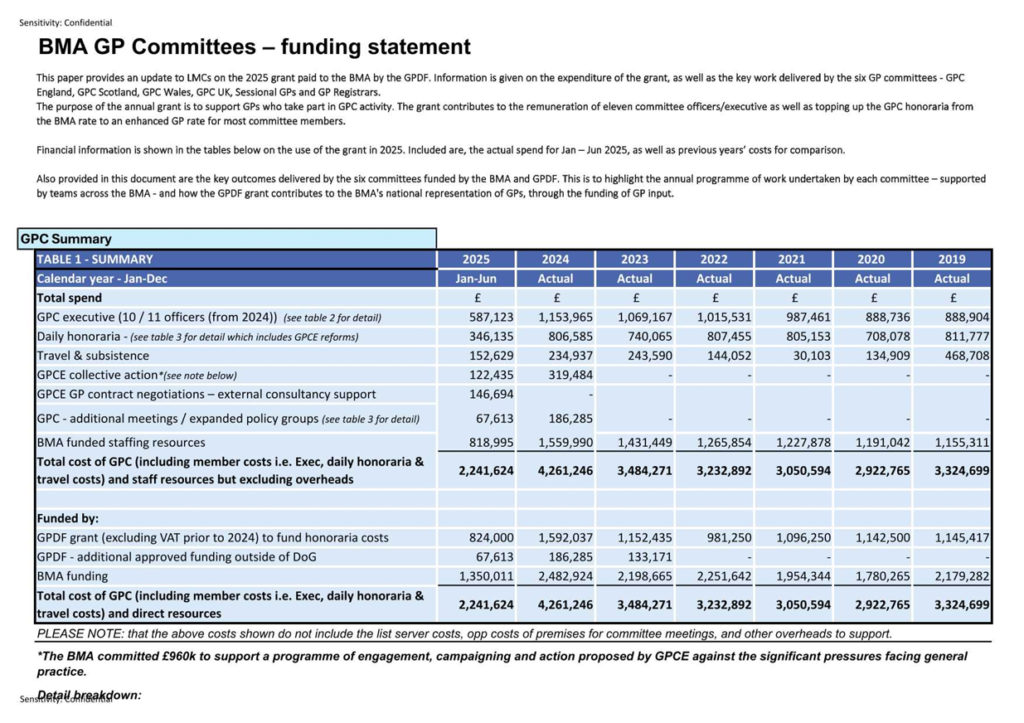 Table 1 shows the total costs of the GPCs (6 committees – GPCUK, GPC England, GPC Scotland, GPC Wales, Sessional GPs and GP Registrars) – “daily honoraria” refers to the top ups. The table shows the relative contributions of the GPDF and BMA towards GPC costs